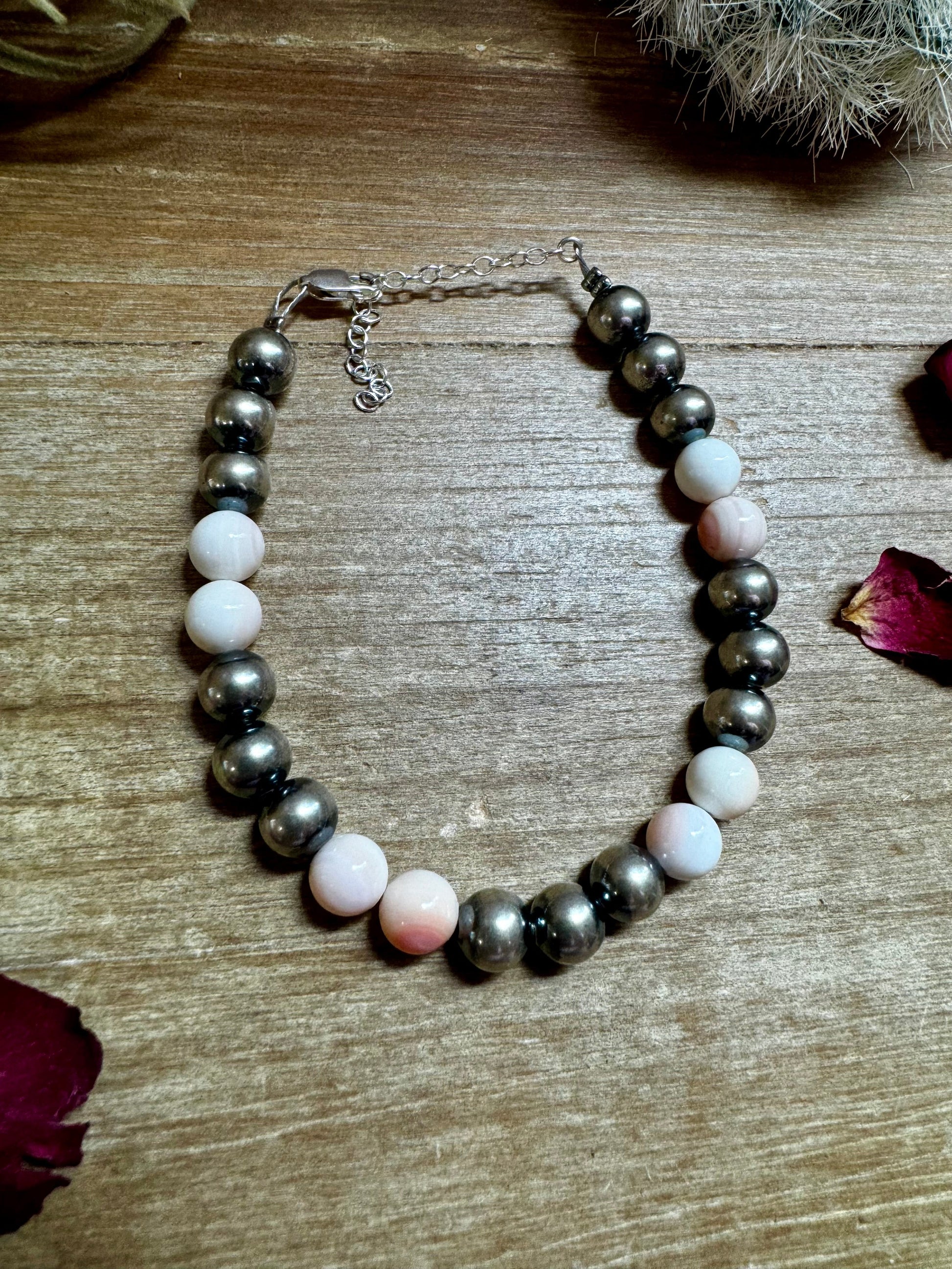 8 mm Sterling Silver Pearls bracelet with pink conch beads