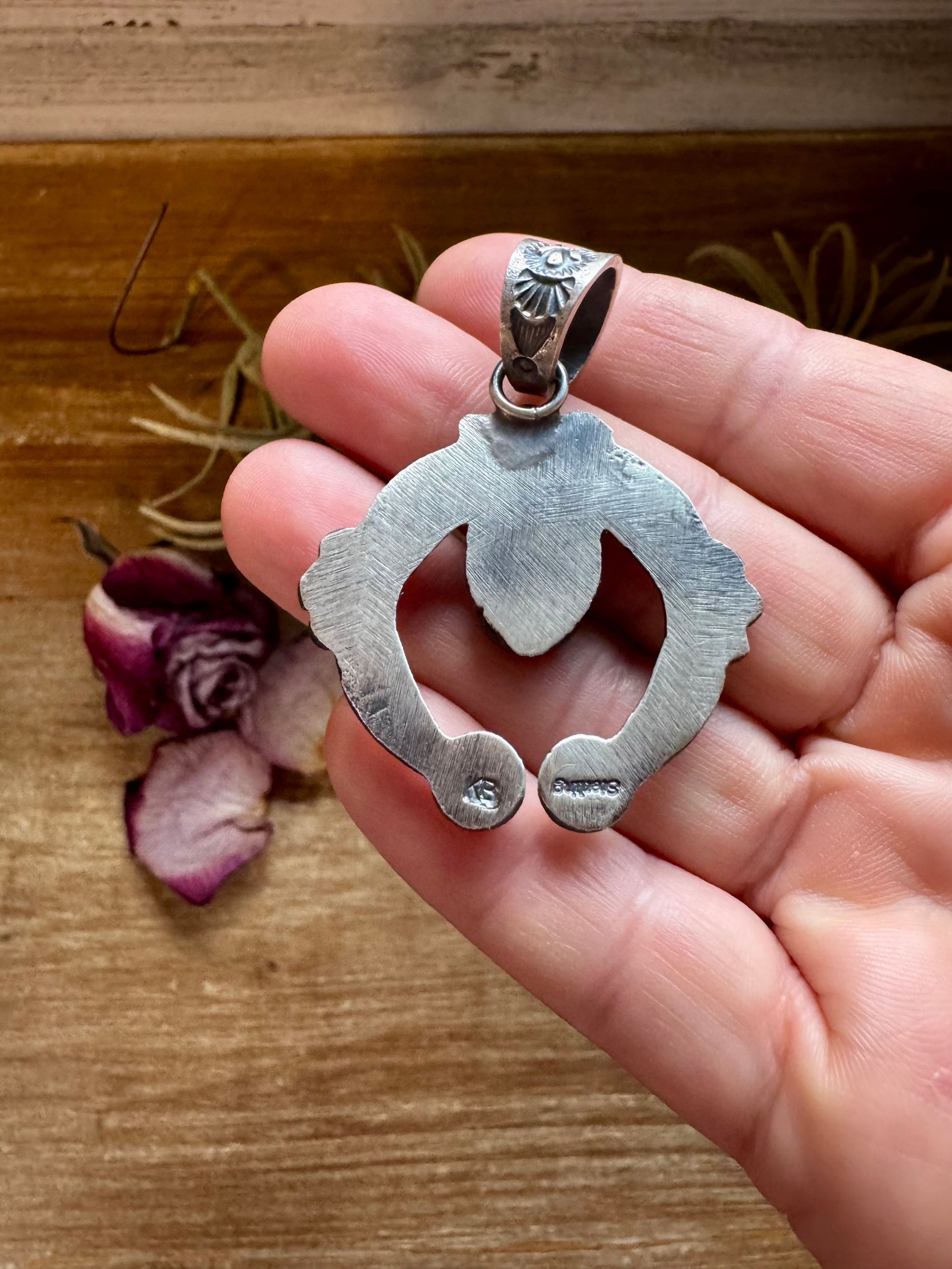 Handmade in the USA, this sterling silver Naja pendant features vibrant spiny oyster in a unique blend of orange and purple tones. Stamped KB for authenticity, it showcases traditional Native silversmithing paired with the natural beauty of spiny oyster shell. The bail fits up to 8mm pearls, making it perfect to wear with a sterling silver pearl strand or layer with other Southwestern pieces. A one-of-a-kind pendant with stunning color contrast.