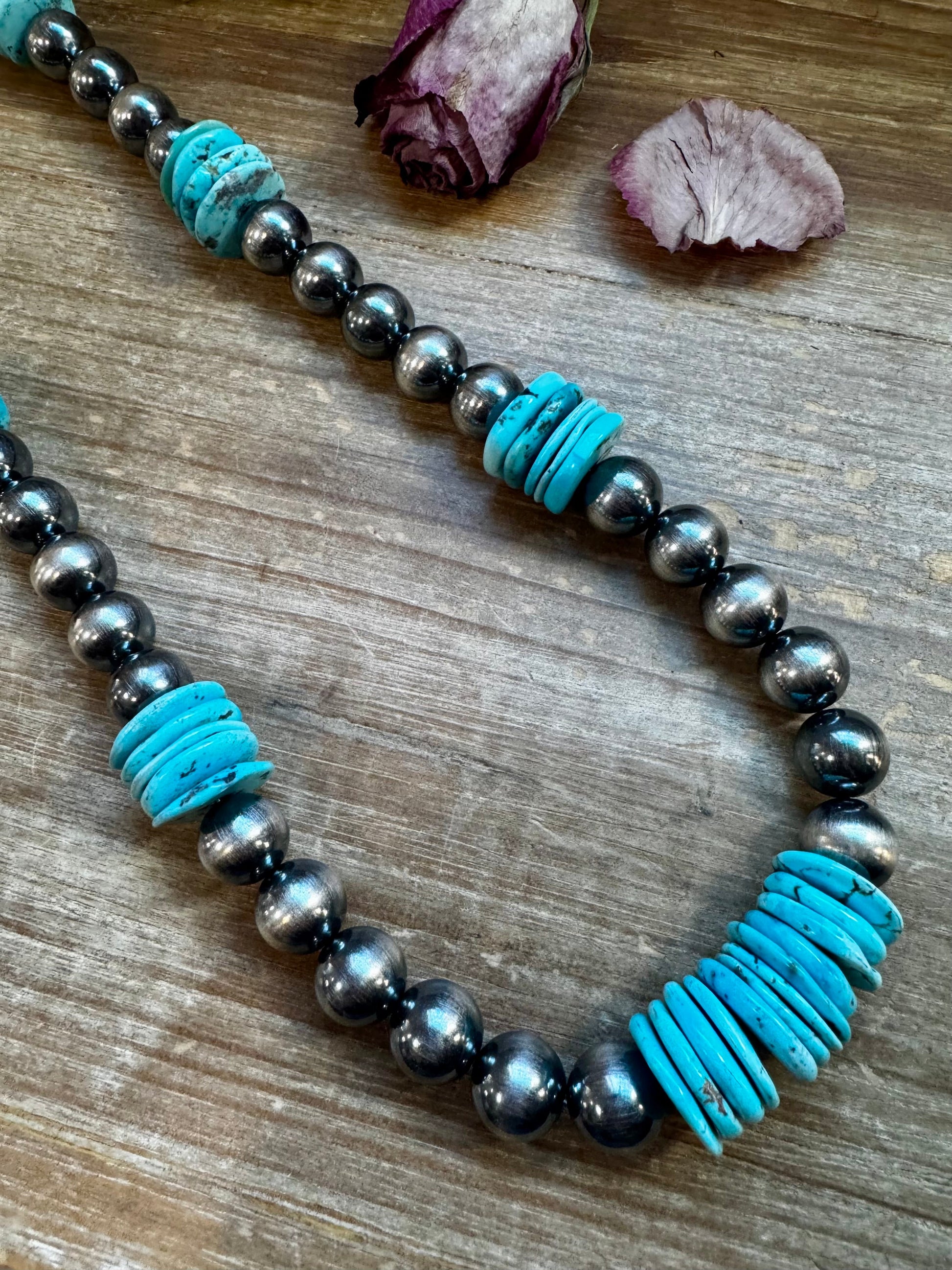 Part of our exclusive NFR Collection, this one-of-a-kind necklace was handmade in the USA by The Bijoux FAB. Measuring 35 inches long, it features a stunning combination of 8mm and 14mm sterling silver pearls, finished with a non-tarnish hook for durability. At its center sits a bold 20mm blue turquoise rondelle, adding the perfect Western touch. Only one was made — a true collector’s piece that stands out with its handcrafted detail and high-quality materials.