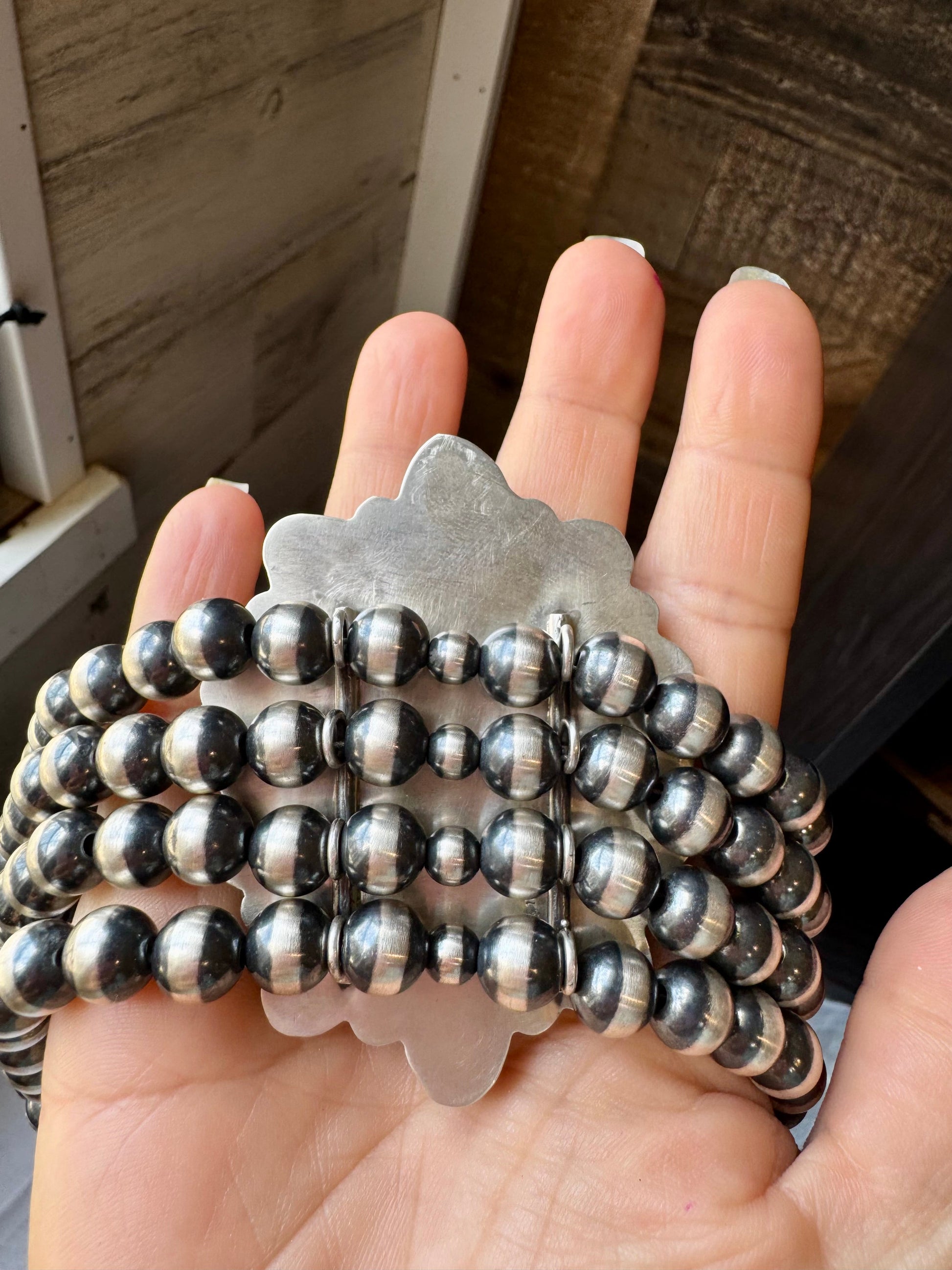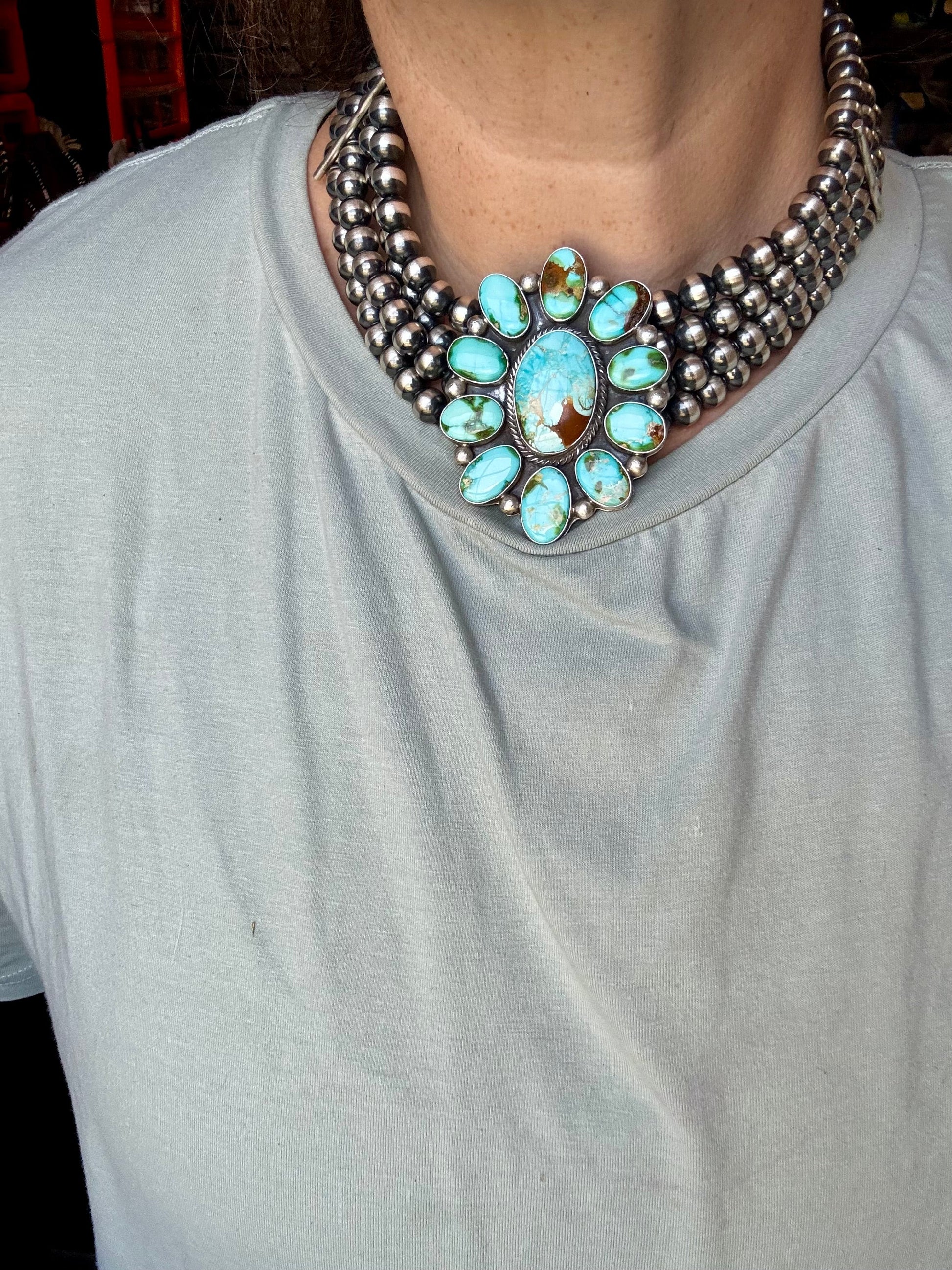 Made by Native silversmith Emerson Thompson, this necklace is truly one of a kind. Featuring all-around Sonoran turquoise stones and finished with 10 mm sterling silver pearls, it gives a bold, elegant feel with a handcrafted soul.